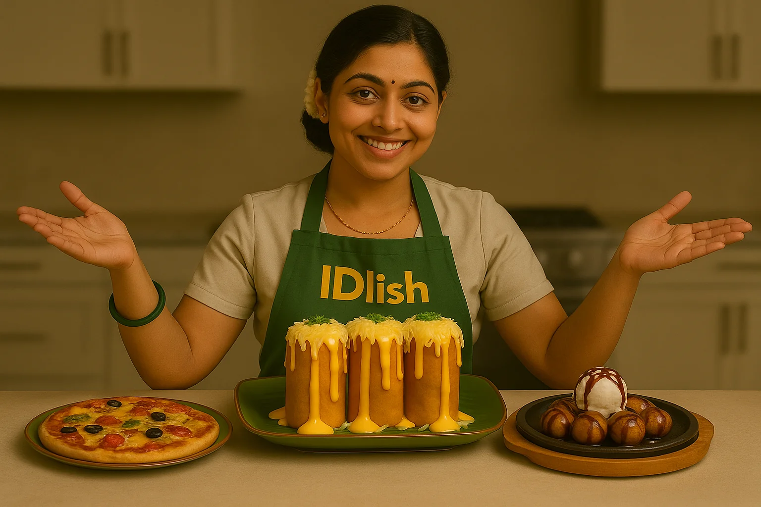 Main image: A vibrant collage of fusion favourites — Piri Piri Idli, Oriental Idli, Triple Cheese Lava Dosa, Pizza Uthappam, Choco Lava Paniyaram, and Filter Coffee Ice Cream. Overlay text: “There’s Something for Everyone @ IDlish — Where Tamil Flavours Meet the World.” Background: warm tones, banana leaves, and brassware for traditional balance.